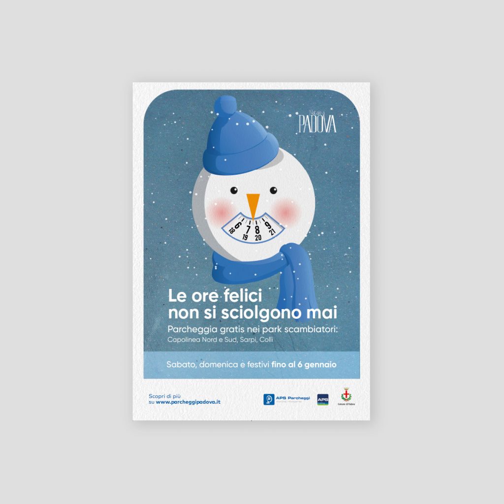 Protagonista di questa campagna è un simpatico pupazzo di neve che ci ricorda che lasciando l’auto nei parcheggi scambiatori, è possibile raggiungere in pochi minuti il centro storico con i mezzi pubblici, immergendosi nello spirito natalizio senza la preoccupazione dell’orario segnato dal parchimetro.